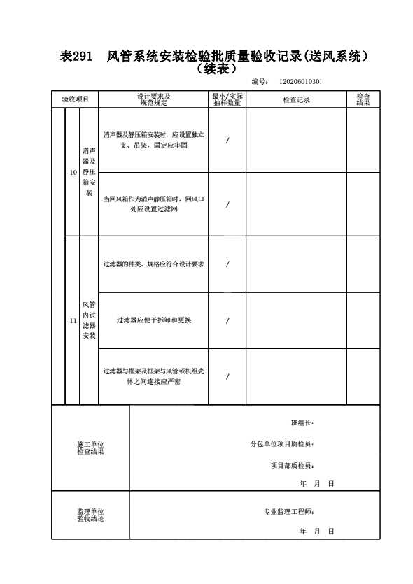 表格名称:120206010301 风管系统安装检验批质量验收记录(送风系统)