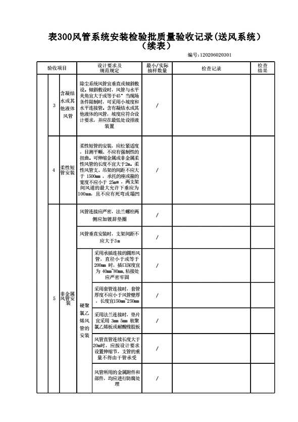 表格名称:120206020301 风管系统安装检验批质量验收记录(送风系统)
