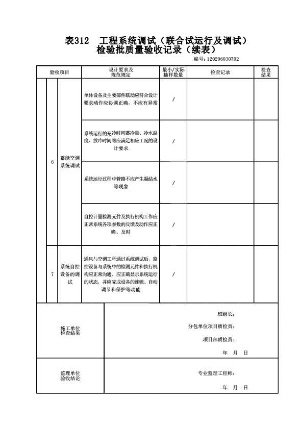 表格名称:120206030702 工程系统调试(联合试运行及调试)检验批质量验收记录