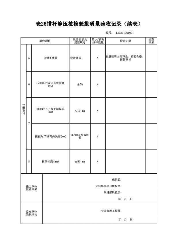 表格名称:130301061001 锚杆静压桩检验批质量验收记录