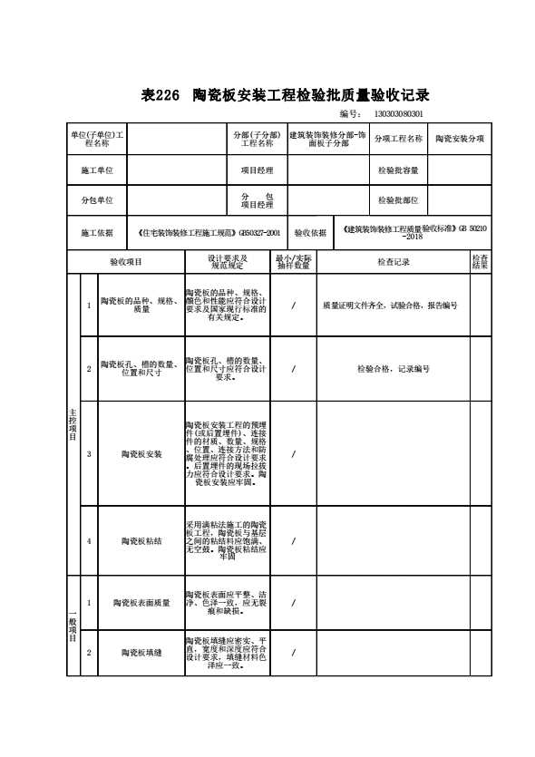 表格名称:130303080301 陶瓷板安装工程检验批质量验收记录