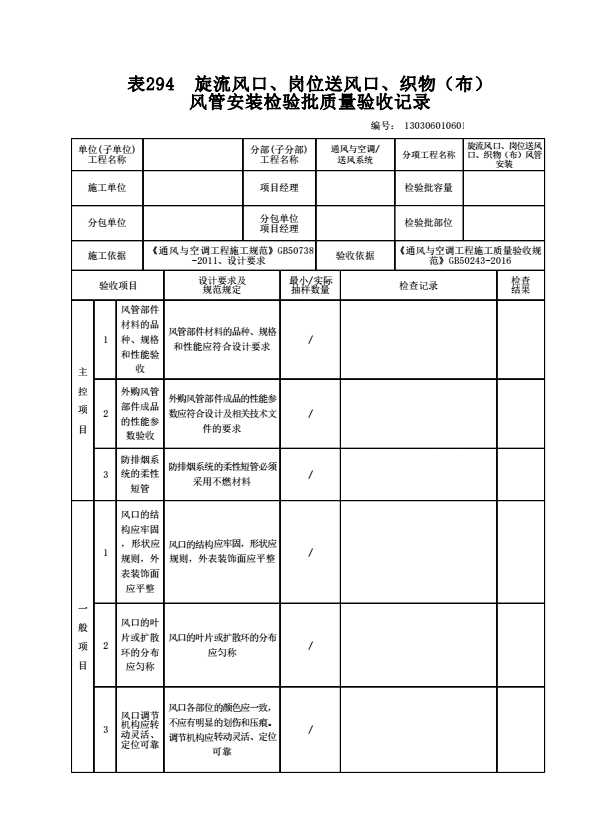 表格名称:130306010601 旋流风口、岗位送风口、织物(布)风管安装检验批质量验收记录