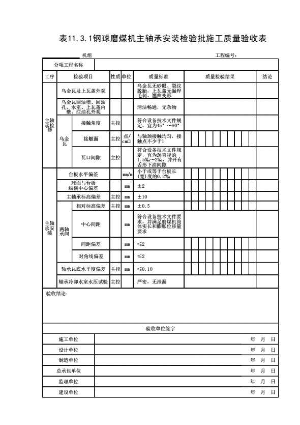 表格名称:表11.3.1 钢球磨煤机主轴承安装检验批施工质量验收表
