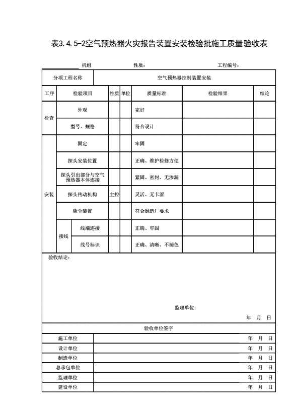 表格名称:表3.4.5-2 空气预热器火灾报告装置安装检验批施工质量验收表