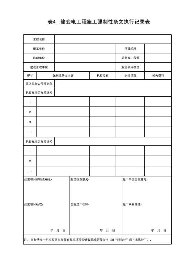 表4 输变电工程施工强制性条文执行记录表