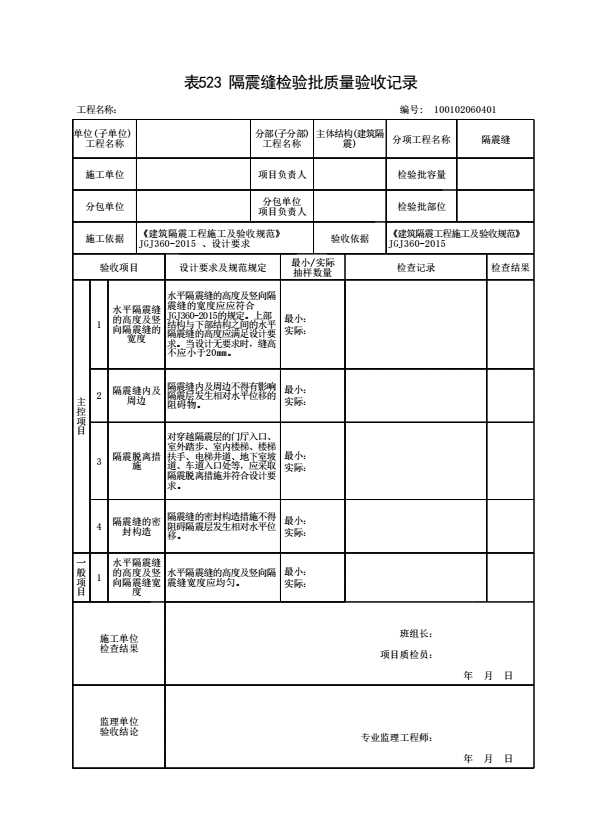 表格名称:100102060401 隔震缝检验批质量验收记录