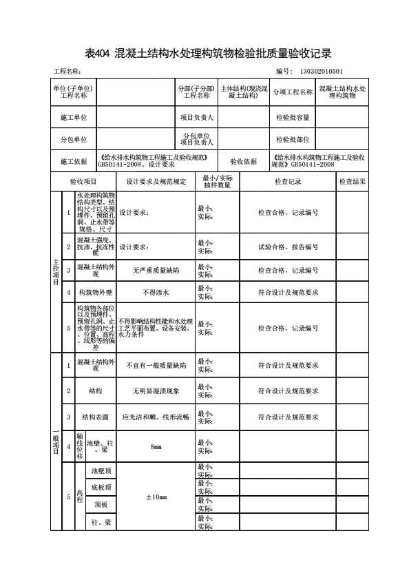 表格名称:130302010501 混凝土结构水处理构筑物检验批质量验收记录
