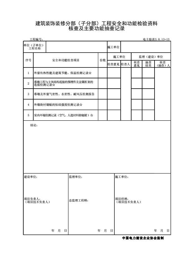 表格名称:电土验表3.0.13-13 建筑装饰装修分部(子分部)工程安全和功能检验资料核查及主要功能抽查记录