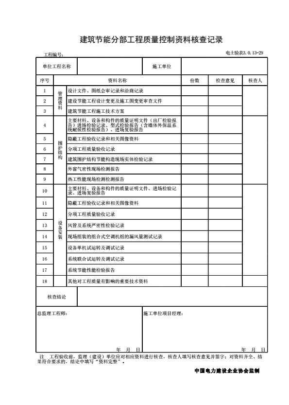 表格名称:电土验表3.0.13-29 建筑节能分部工程质量控制资料核查记录