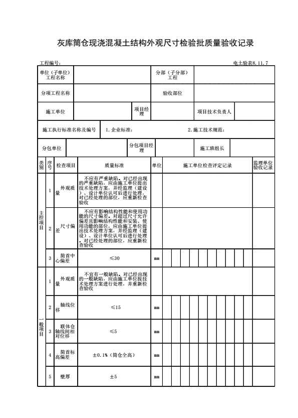 表格名称:电土验表8.11.7 灰库筒仓现浇混凝土结构外观及尺寸检验批质量验收记录