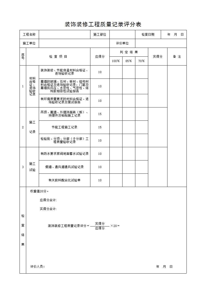 装饰装修工程质量记录评分表