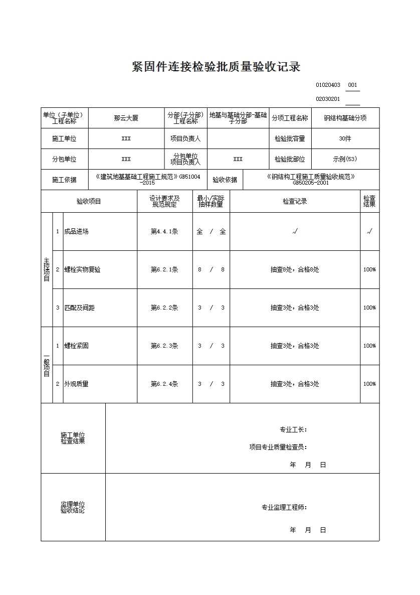 本表适用于钢结构连接用紧固标准配件的品种、规格、性能及钢结构制作和安装中的普通螺栓、扭剪型高强度螺栓、高强度大六角头螺栓、钢网架螺栓球节点用高强度螺栓及射击钉、自攻钉、拉铆钉等连接工程的检验批质量验收。