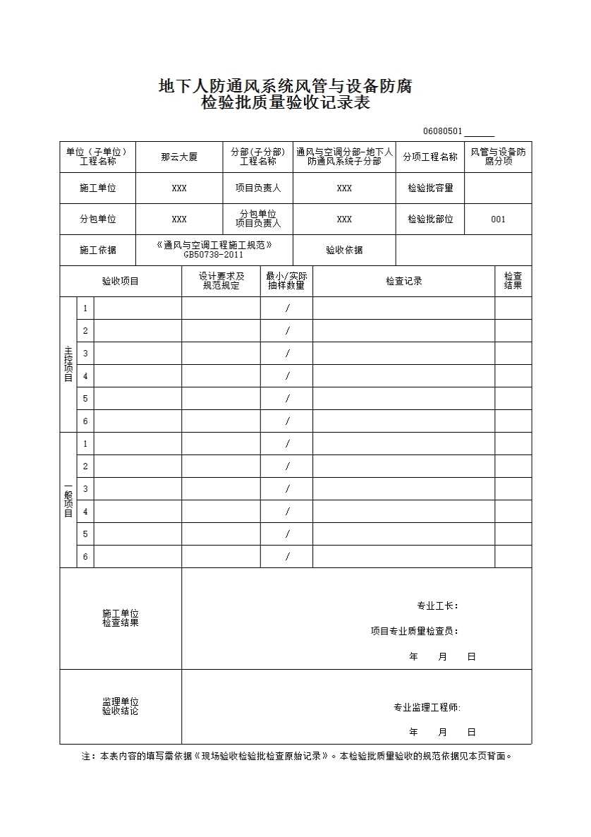 表格名称:06080501_地下人防通风系统风管与设备防腐检验批质量验收记录表