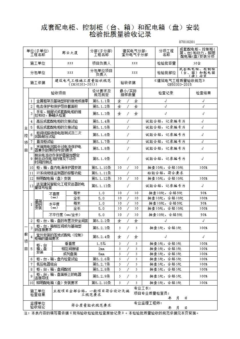 07010201 成套配电柜、控制柜(台、箱)和配电箱(盘)安装检验批质量验收记录