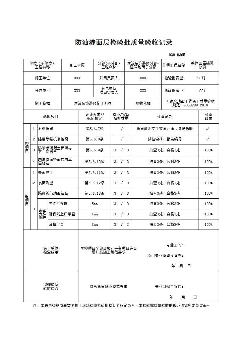 表格名称:03010205_防油渗面层检验批质量验收记录