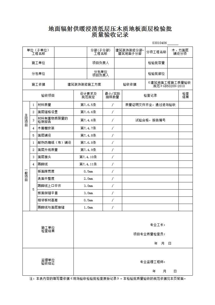 表格名称:03010406_地面辐射供暖浸渍纸层压木质地板面层检验批质量验收记录