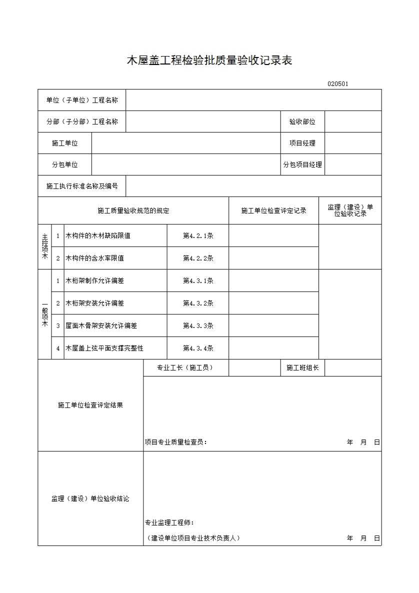 表格名称:木屋盖工程检验批质量验收记录表