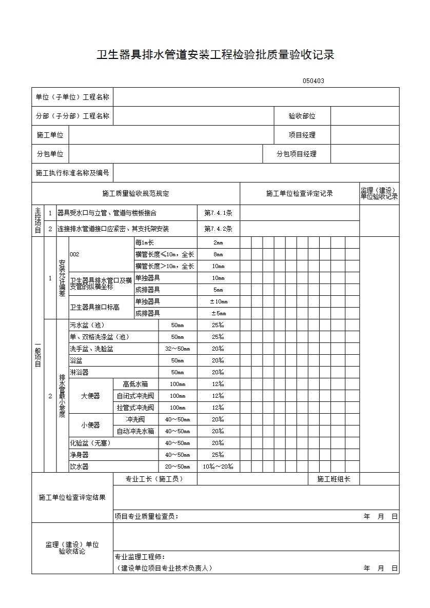 表格名称:卫生器具排水管道安装工程检验批质量验收记录
