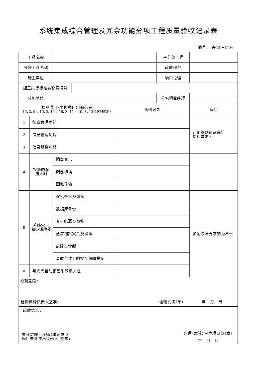 表格名称:系统集成综合管理及冗余功能分项工程质量验收记录