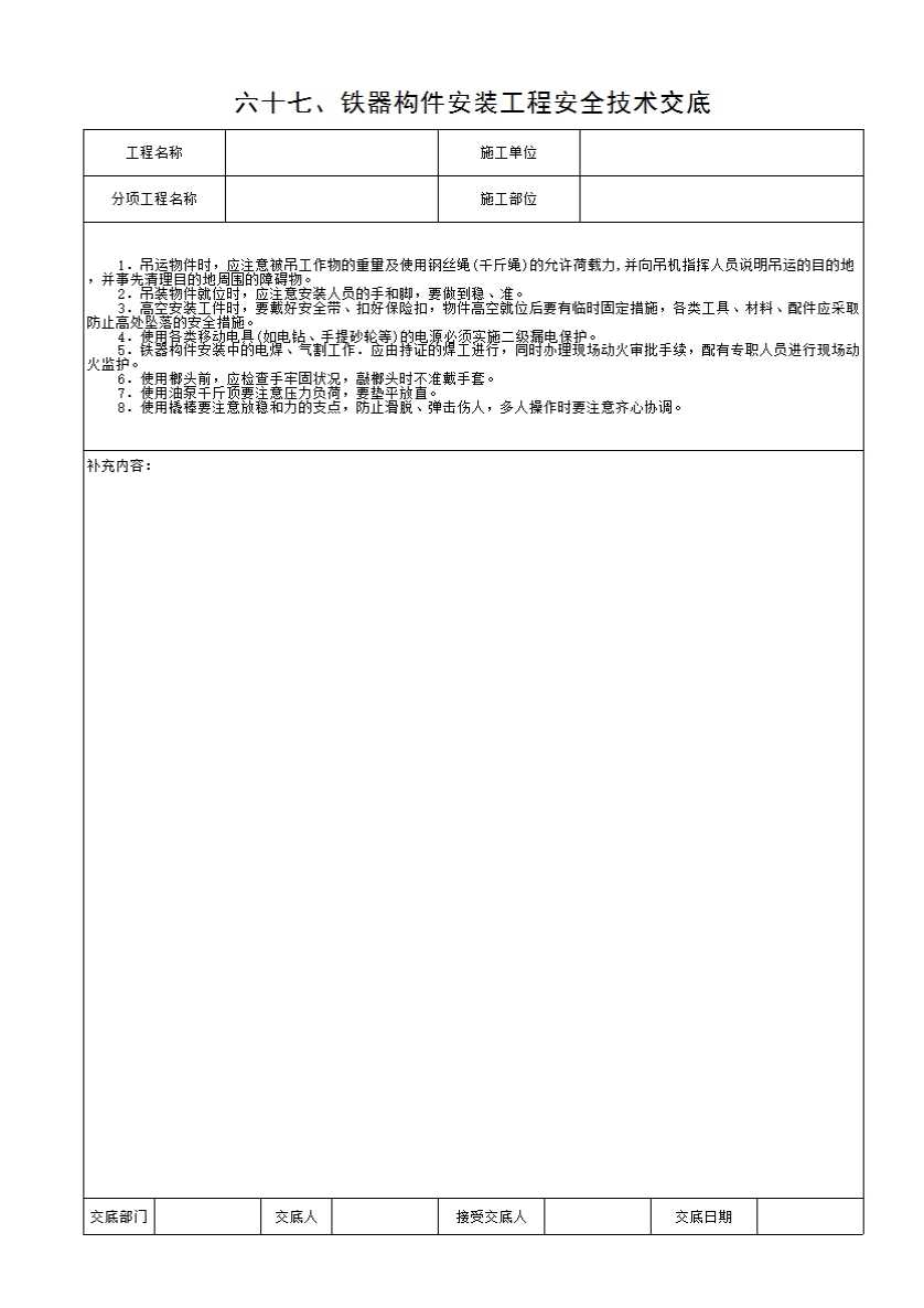 表格名称:67、铁器构件安装工程安全技术交底