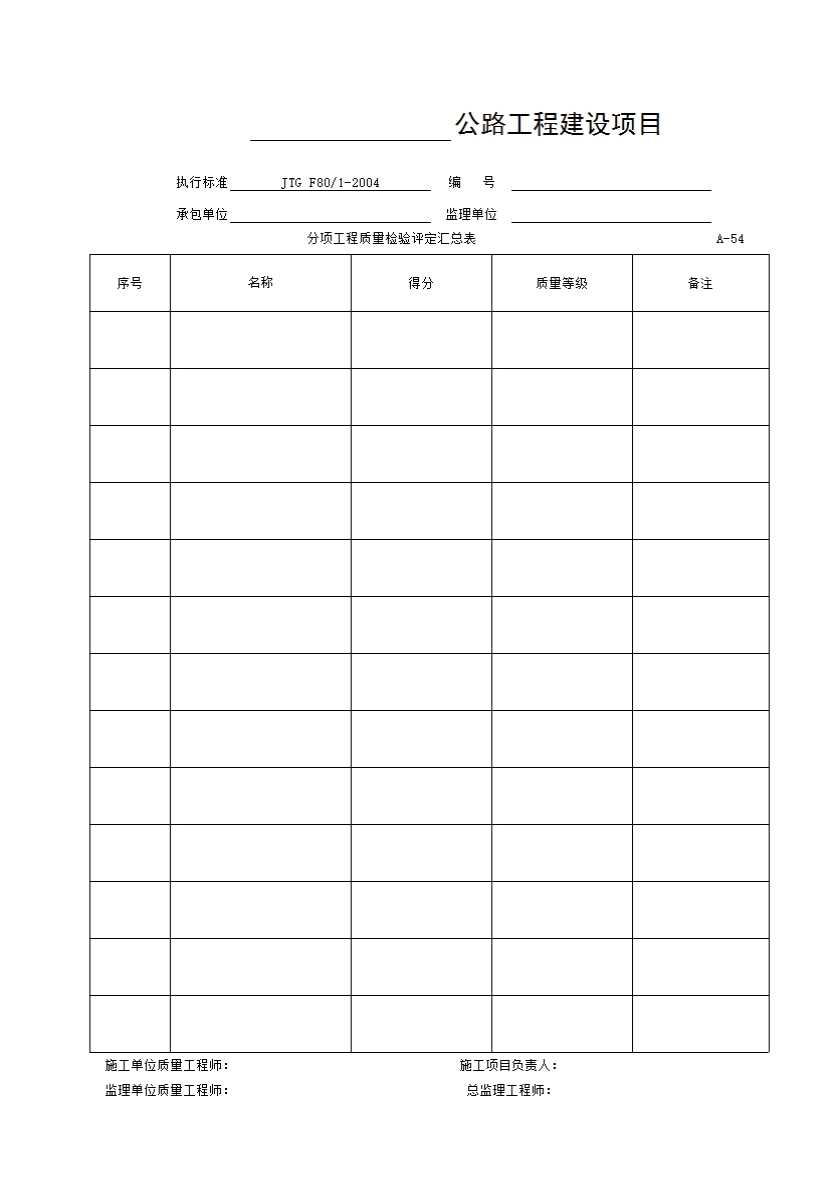 表格名称:A-54表 分项工程质量检验评定汇总表