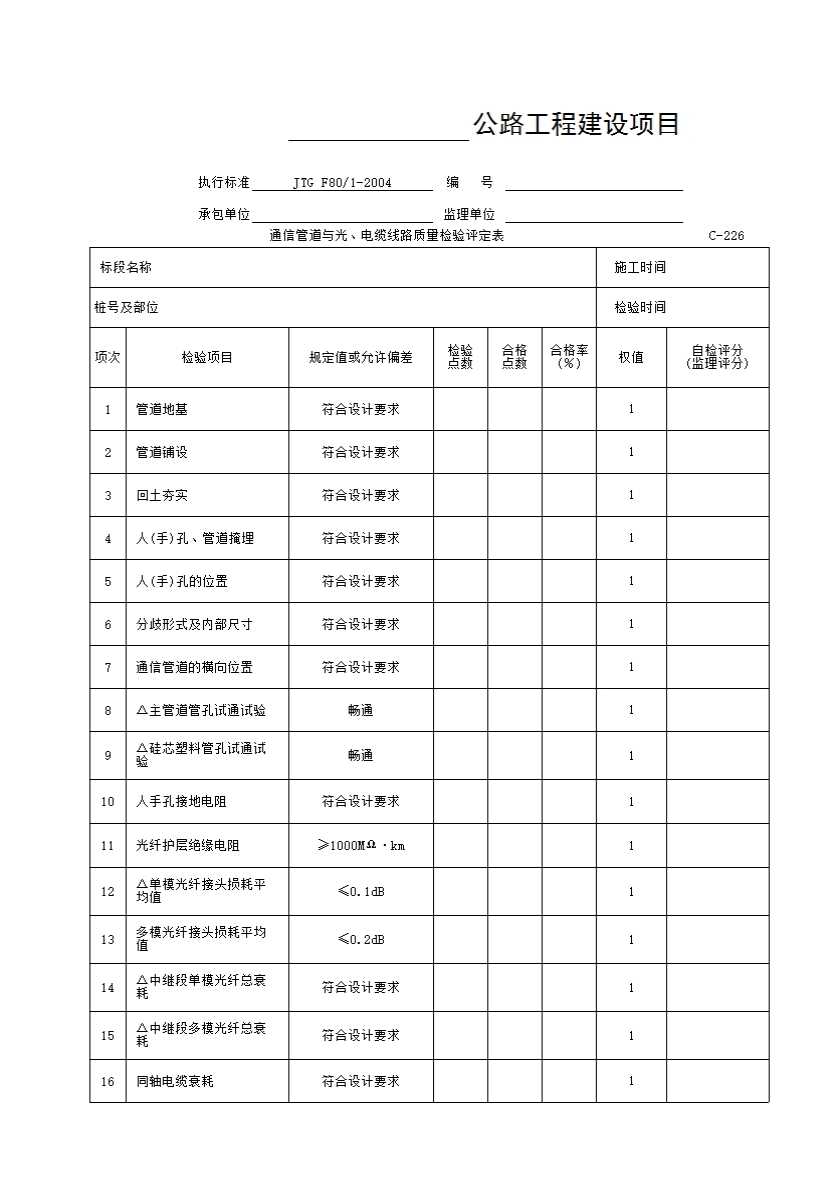 表格名称:C-226表 通信管道与光、电缆线路质量检验评定表