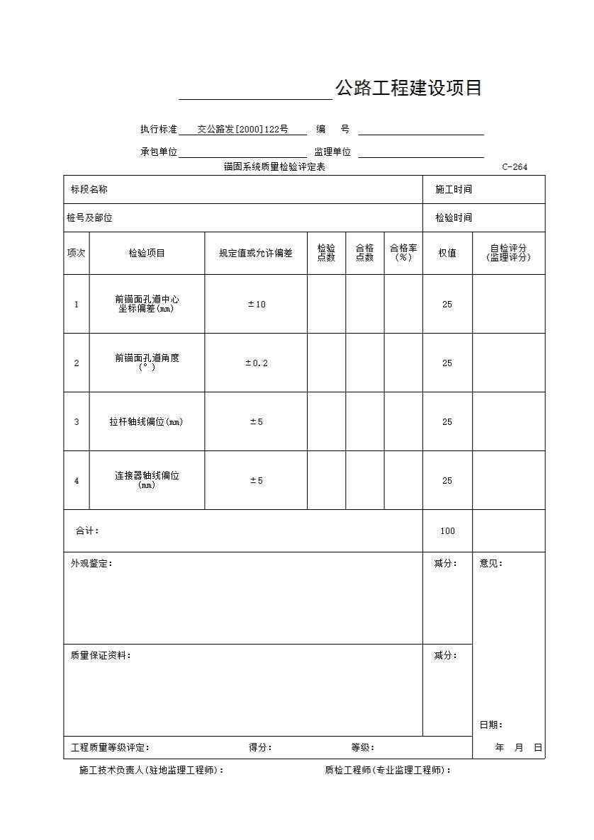 表格名称:C-264表 锚固系统质量检验评定表