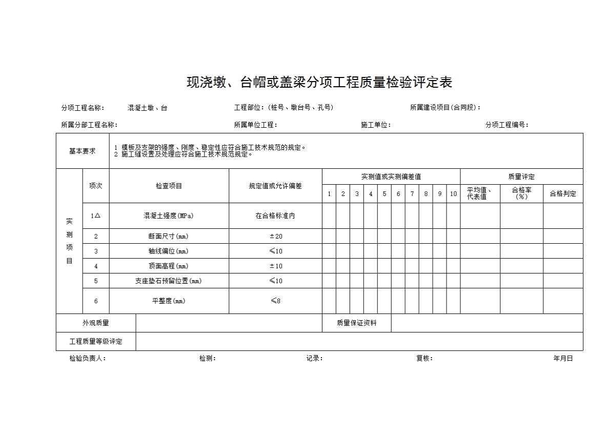 表格名称:现浇墩、台帽或盖梁分项工程质量检验评定表