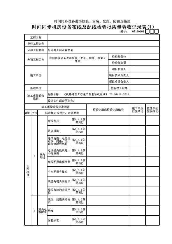 表格名称:07130101 【时间同步设备进场检验、安装、配线、防雷及接地】时间同步机房设备布线及配线检验批质量验收记录表(Ⅱ)