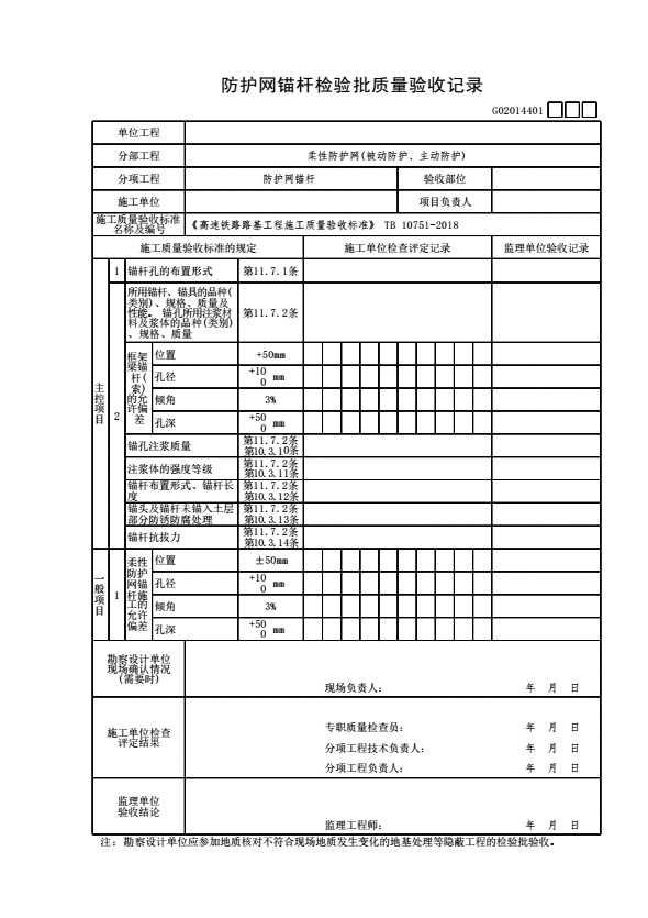 表格名称:G02014401 防护网锚杆检验批质量验收记录