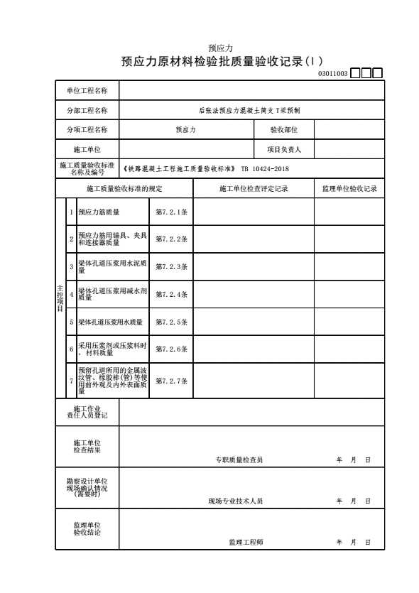 表格名称:03011003 预应力原材料检验批质量验收记录(Ⅰ)