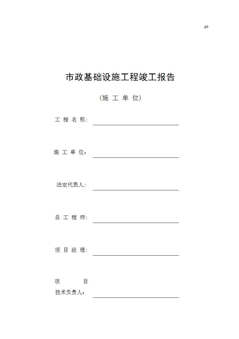 表格名称:A9 市政基础设施工程竣工报告