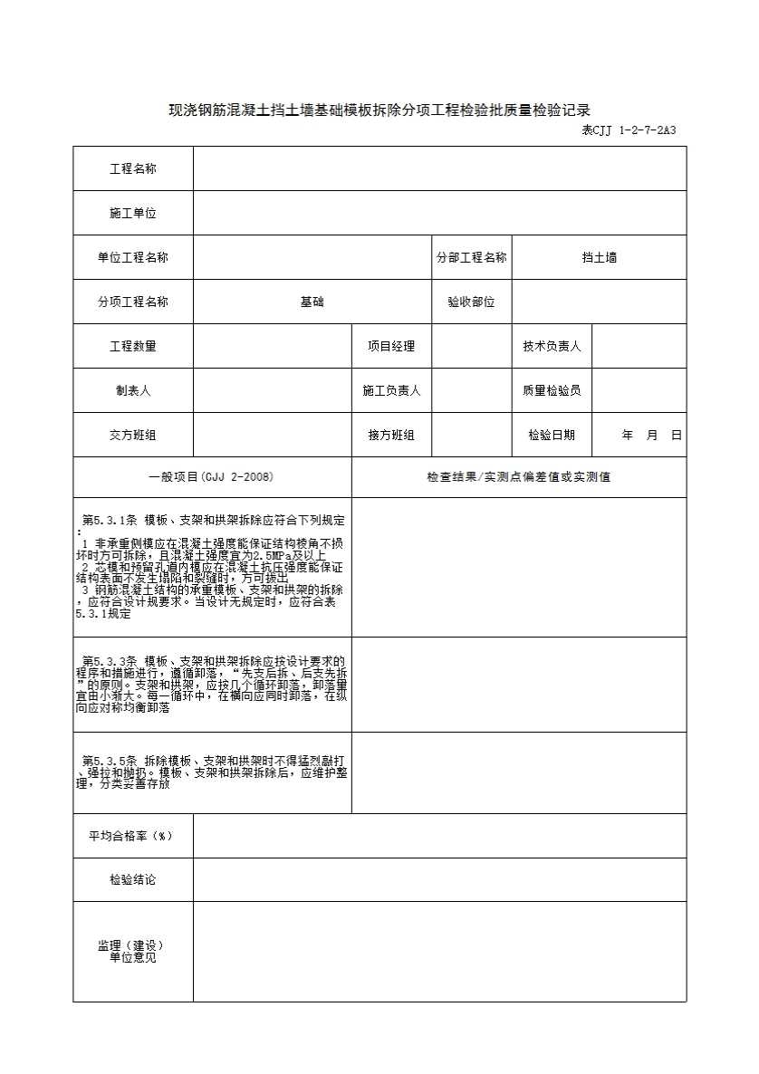 表格名称:表CJJ 1-2-7-2A3 现浇钢筋混凝土挡土墙基础模板拆除分项工程检验批质量检验记录