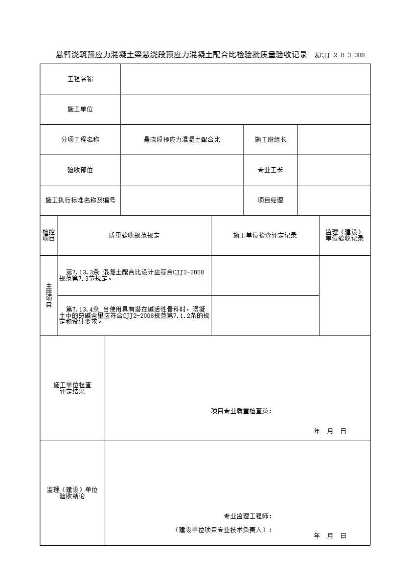 表格名称:表CJJ 2-8-3-30B 悬臂浇筑预应力混凝土梁悬浇段预应力混凝土配合比检验批质量验收记录