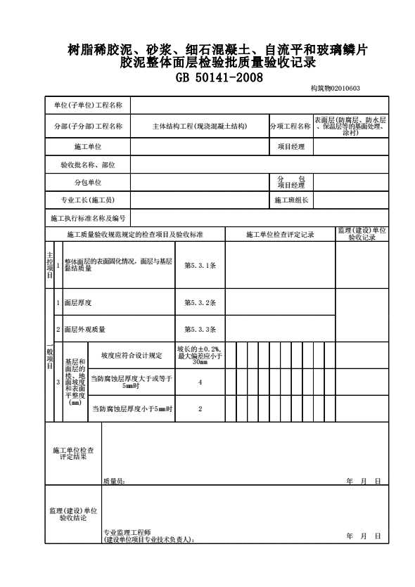 5.3.1树脂稀胶泥、砂浆、细石混凝土、自流平和玻璃鳞片胶泥整体面层的表面应固化完全,面层与基层黏结应牢固,并应无起壳、脱层、气泡和裂纹等现象。