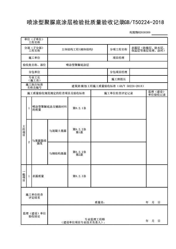 9.2.3喷涂聚月尿底涂层表面应固化、平整、涂层应无龟裂、起壳和漏涂等现象。