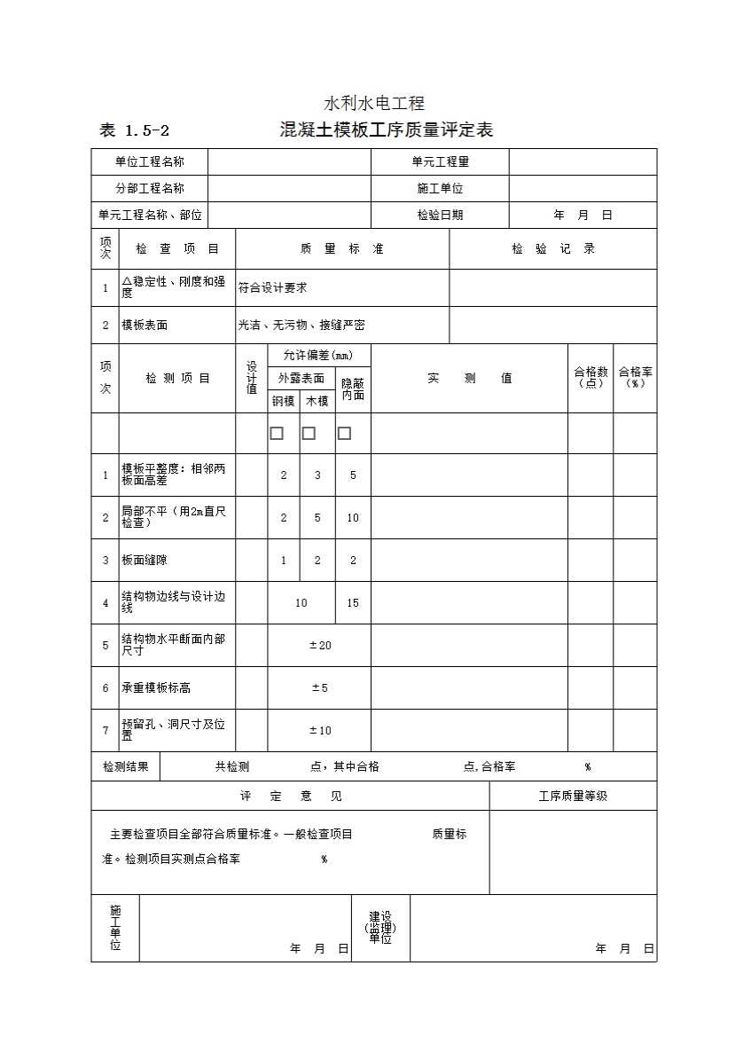 表格名称:表1.5-2 混凝土模板工序质量评定表