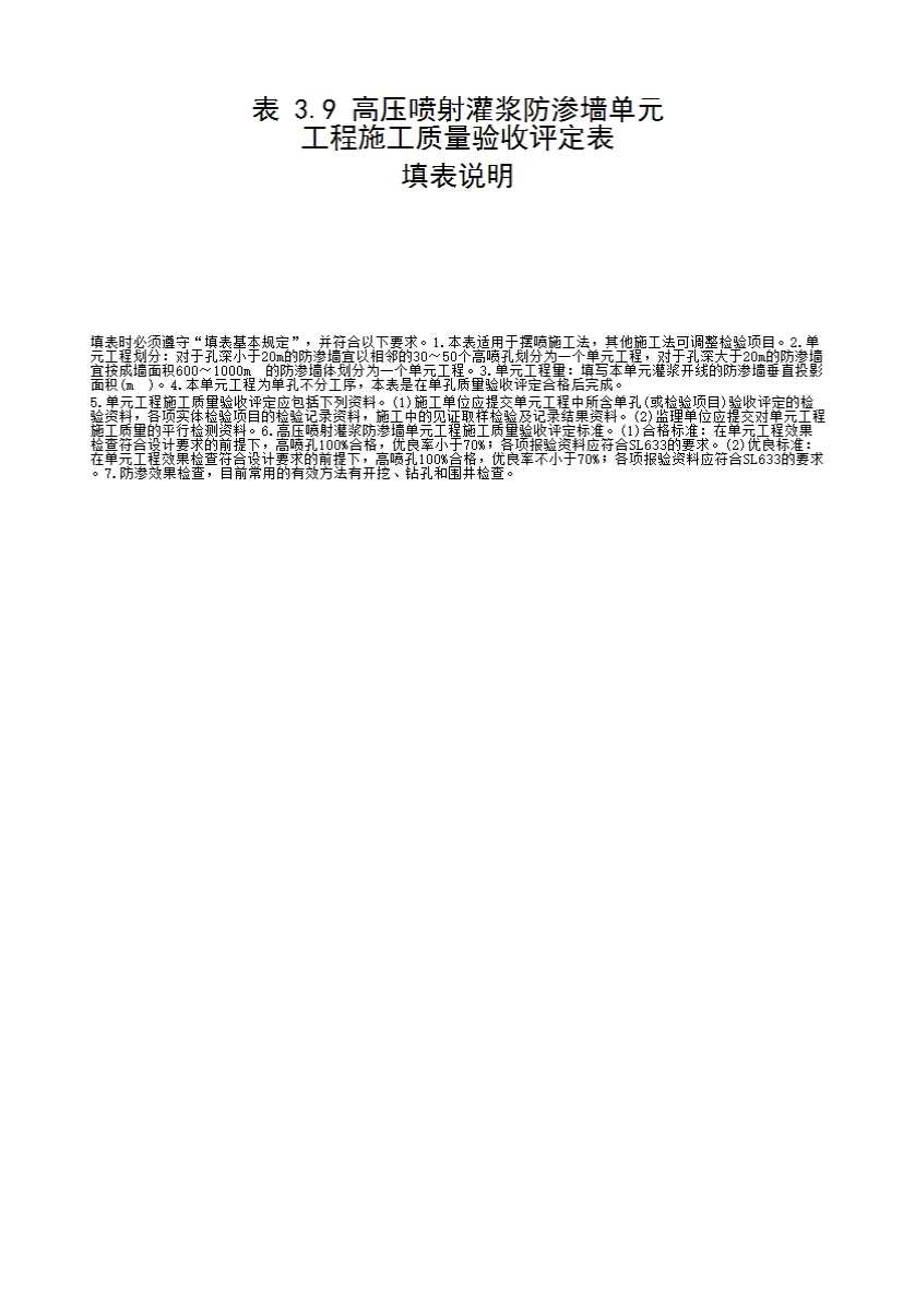 表格名称:表3.9 高压喷射灌浆防渗墙单元工程施工质量验收评定表