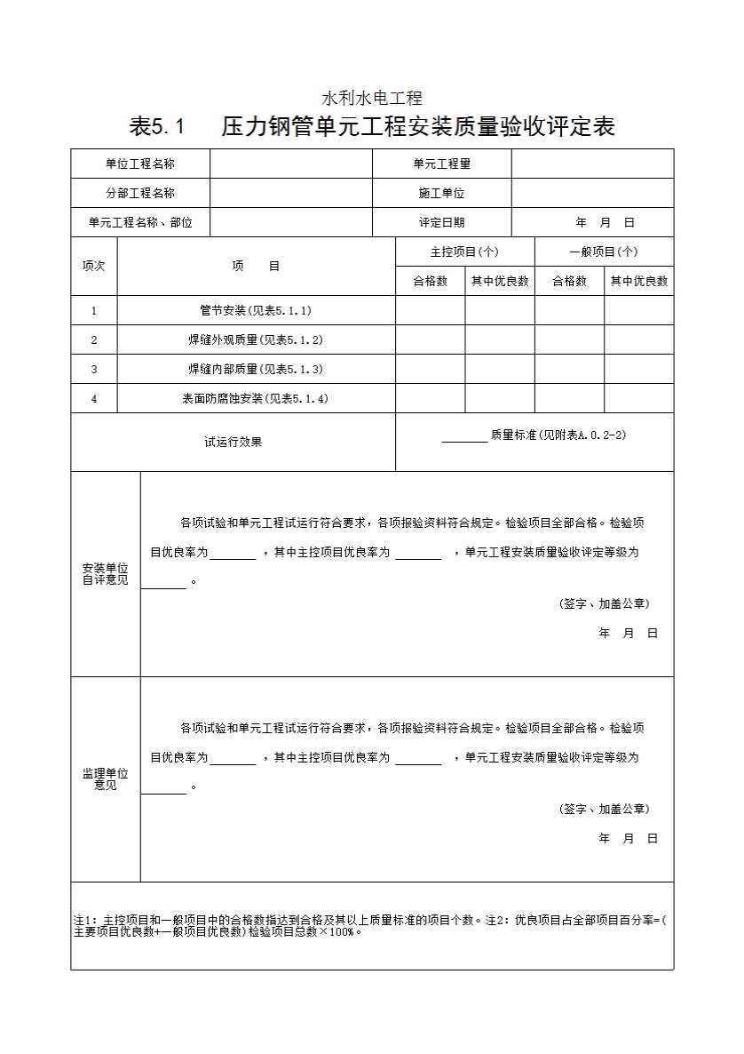 表格名称:表5.1 压力钢管单元工程安装质量验收评定表