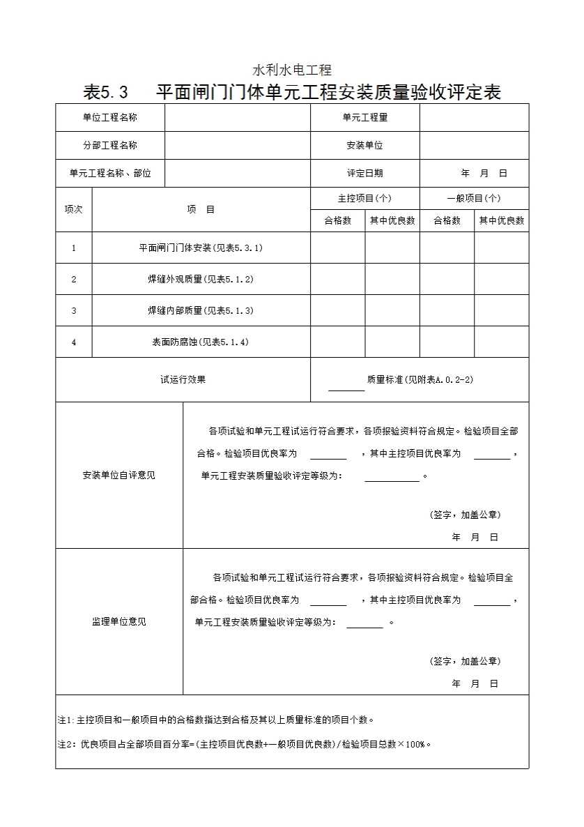 表格名称:表5.3 平面闸门门体单元工程安装质量验收评定表