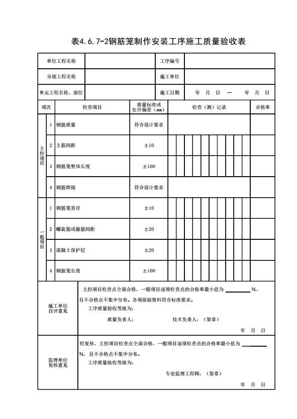 表格名称:表4.6.7-2 钢筋笼制作安装工序施工质量验收表