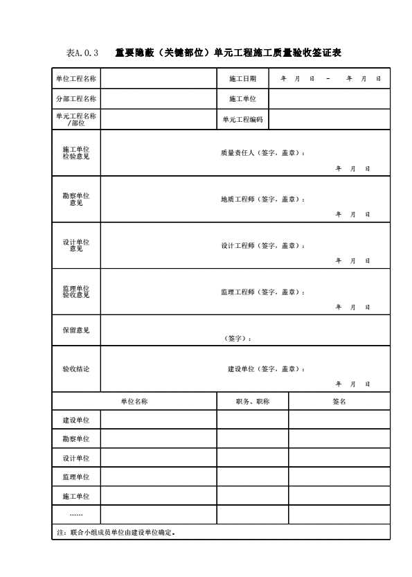 表A.0.3 重要隐蔽(关键部位)单元工程施工质量验收签证表