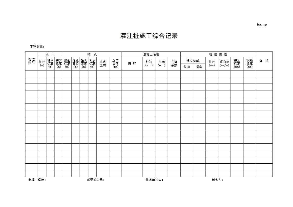 表格名称:39、(评A-39)灌注桩施工综合记录