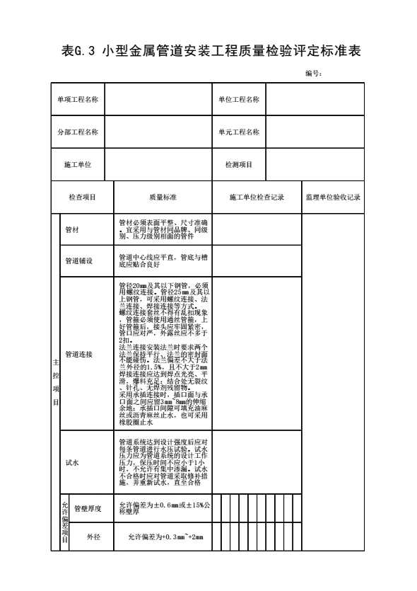 表格名称:表G.3 小型金属管道安装工程质量检验评定标准表