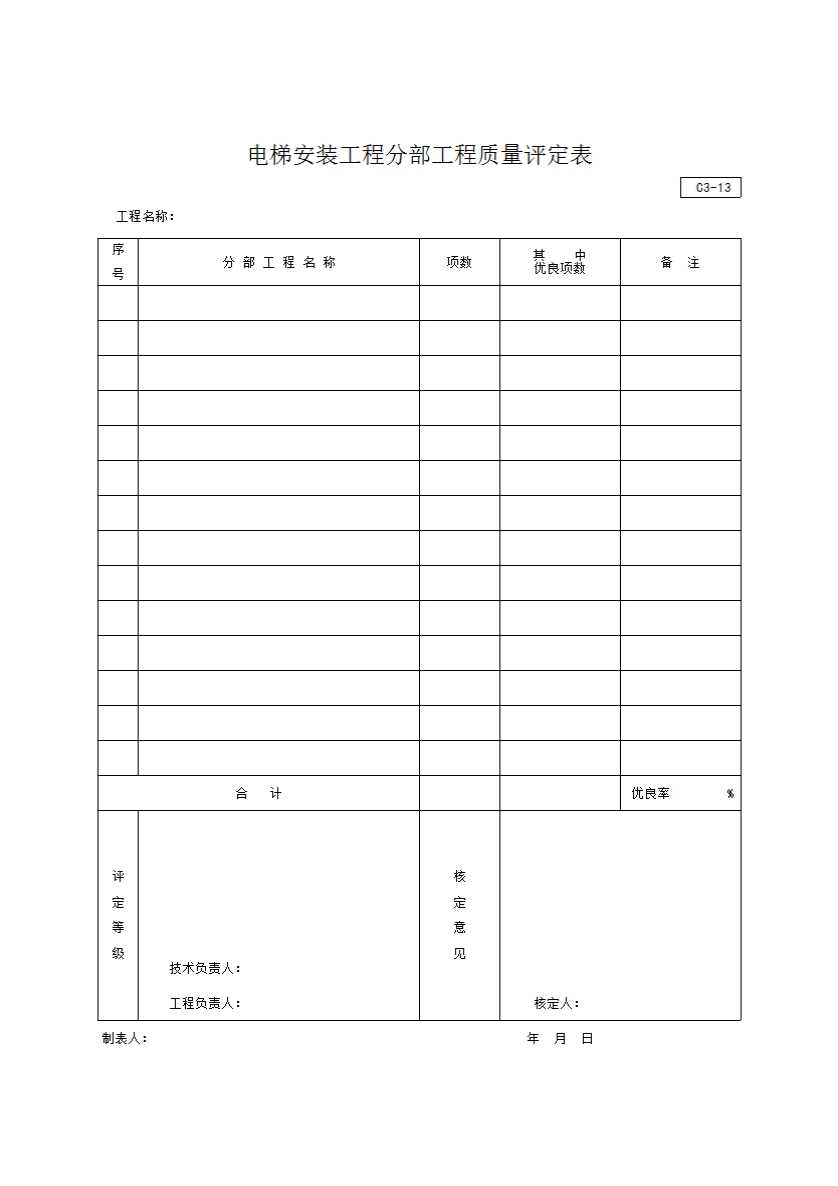 表格名称:C3-13 电梯安装工程分部工程质量评定表