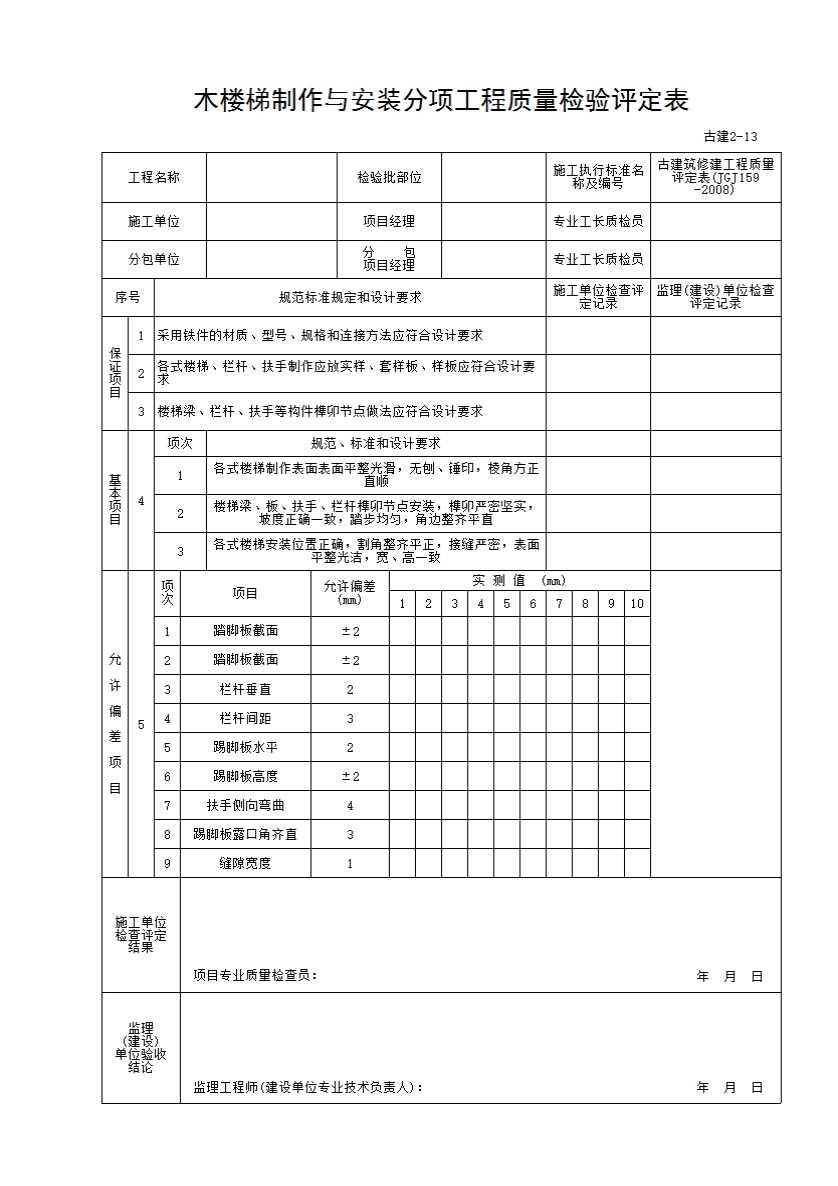 表格名称:古建2-13 木楼梯制作与安装分项工程质量检验评定表