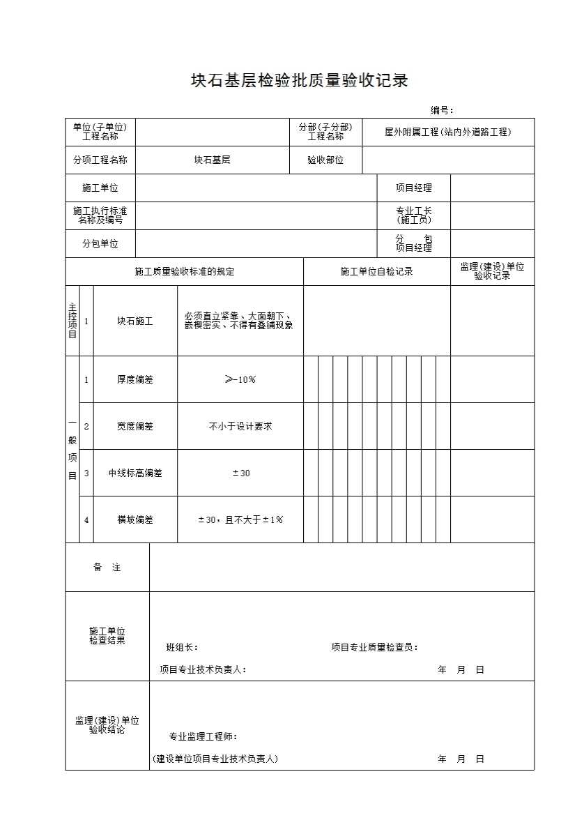 表格名称:块石基层检验批质量验收记录
