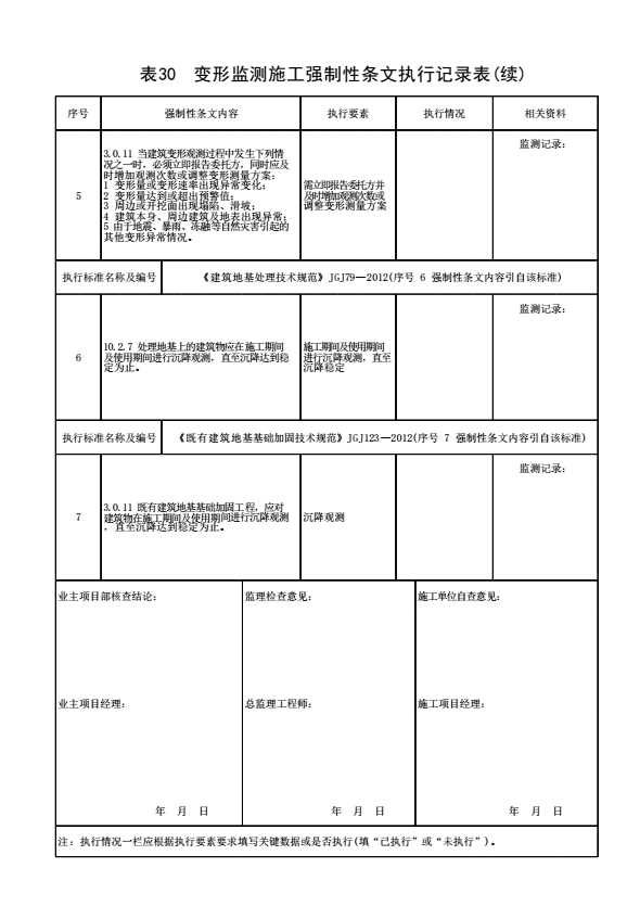 表格名称:表30 变形监测施工强制性条文执行记录表