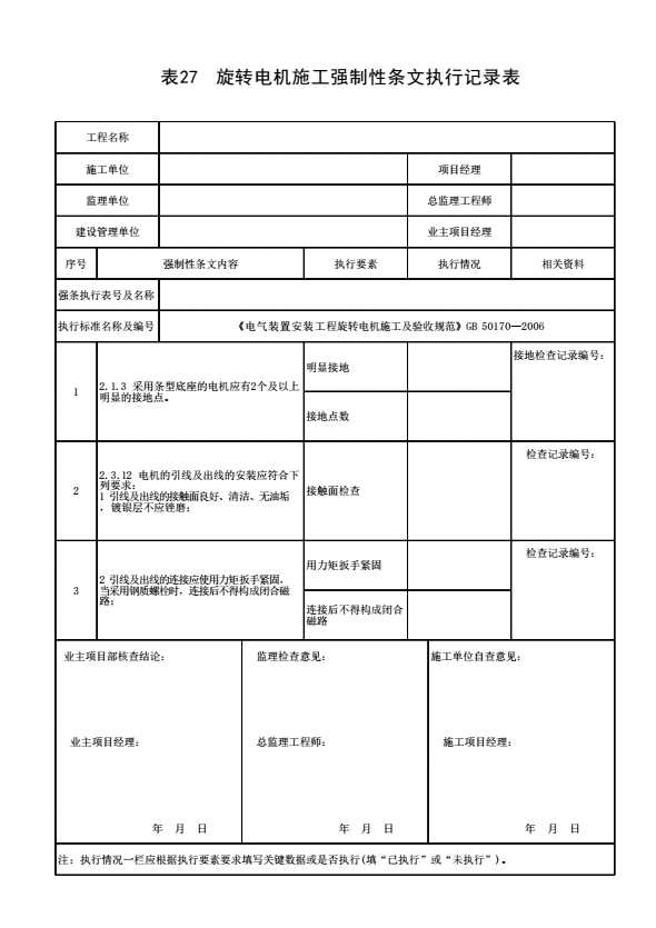 表格名称:表27 旋转电机施工强制性条文执行记录表
