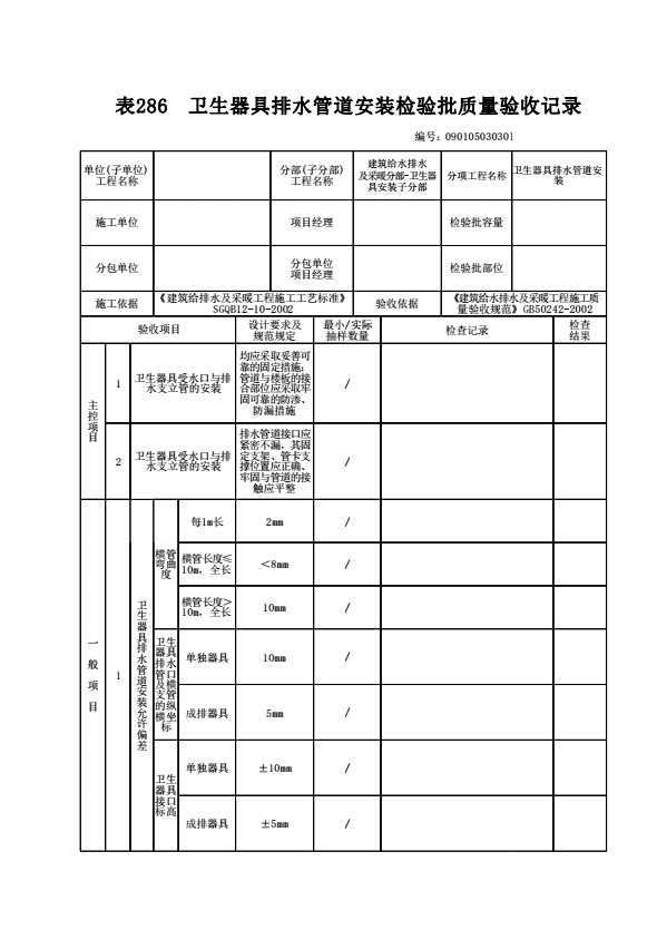 表格名称:090105030301 卫生器具排水管道安装检验批质量验收记录